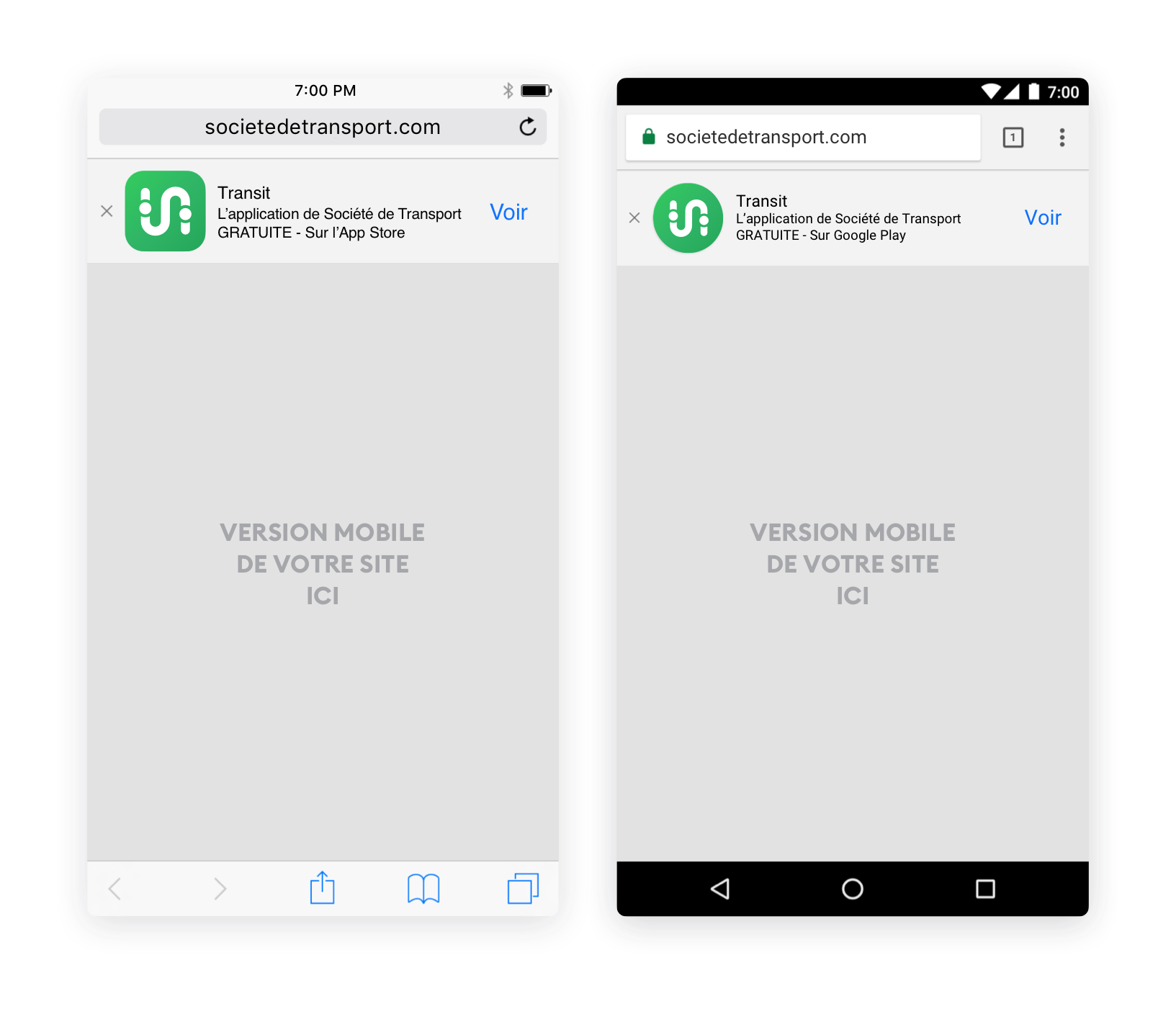 La bannière mobile Transit apparaîtra aux visiteurs de de votre site web mobile et détectera automatiquement l’appareil des utilisateurs (Android ou iPhone). Lorsque ceux-ci cliqueront sur la bannière, ils seront redirigés vers leur App Store respectif afin de télécharger l’application.